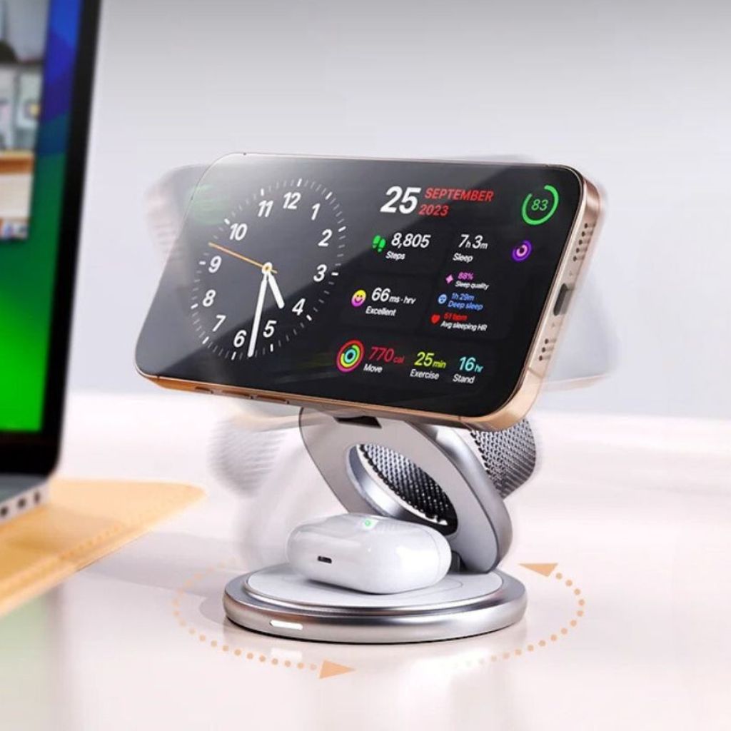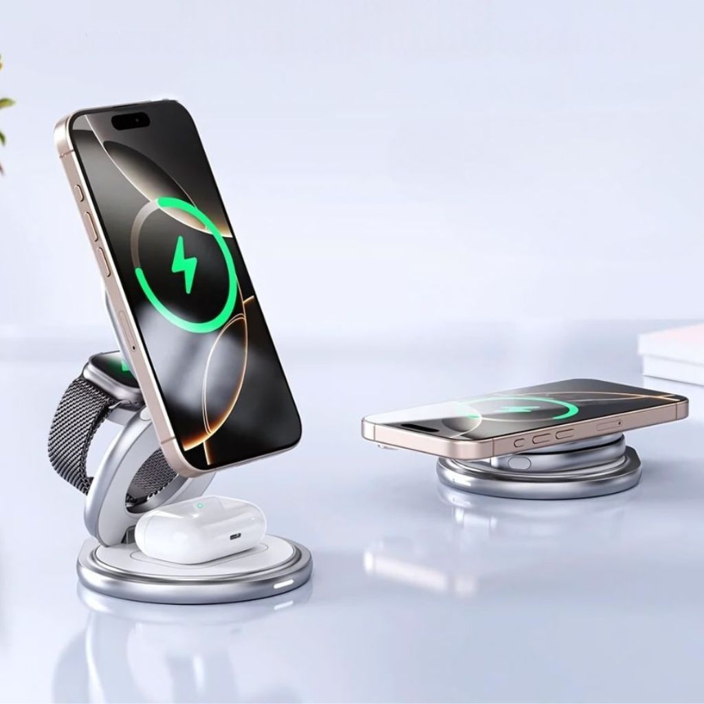Experience the future of wireless charging with Qi2-certified speed and MagSafe precision. Power your iPhone, Apple Watch, and AirPods together in one foldable, travel-ready station — effortless at home, at work, or on the go.