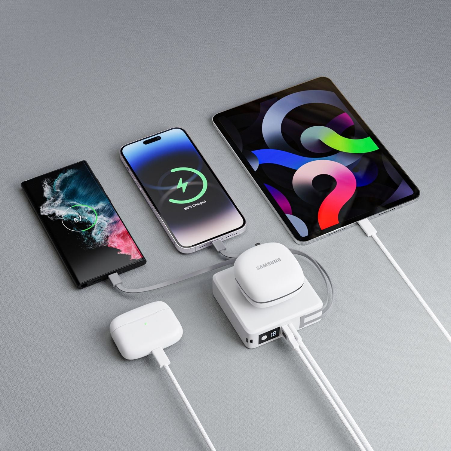 With a battery capacity of 10,000mAh, the Universal Power Bank can charge multiple devices, including the iPhone 13 up to 2.1 charges, Galaxy S22 up to 2.0 charges, Google Pixel 6 up to 1.7 charges, and iPad mini 6th Gen up to 1.3 charges.